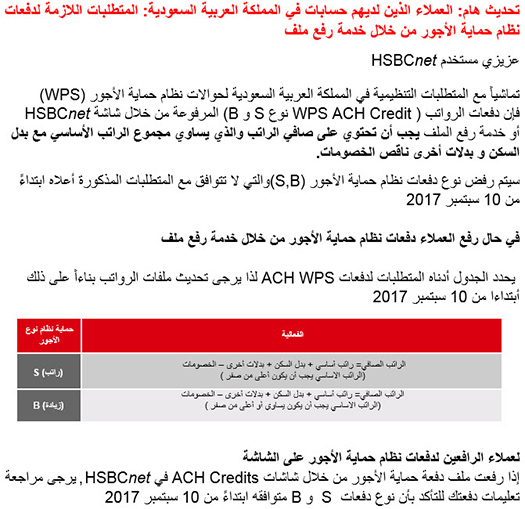 If you submit WPS payments via ACH Credit screens on HSBCnet, please review your payment instructions to make sure that type S and B transactions are compliant by 10 September 2017.For any queries regarding this regulatory requirement, or assistance with your WPS payment files in Saudi Arabia, please contact your local HSBCnet Support Centre.