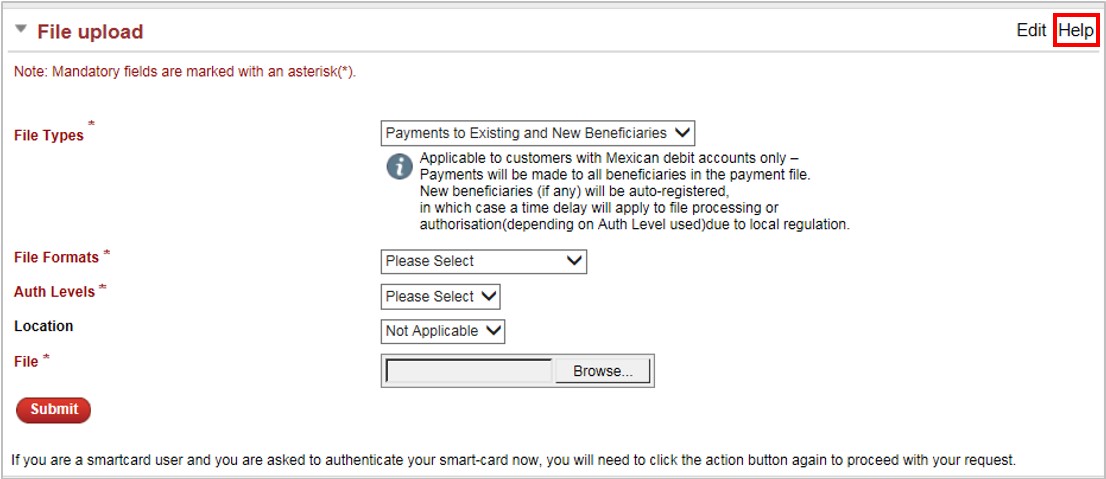 For detailed instructions on registering your beneficiaries on HSBCnet, select ‘Help’ in the File Upload service and review the Beneficiary Registration using payment files formats User Guide.