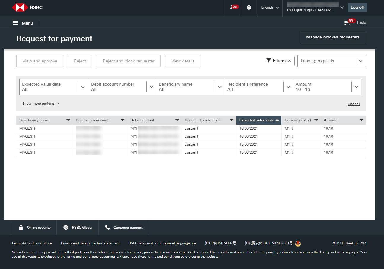 Le 9 mai 2021, nous mettons à jour HSBCnet afin de prendre en charge la nouvelle demande DuitNow qui sera disponible pour vos comptes HSBC en Malaisie. Grâce au service de demande DuitNow, vous pourrez recevoir des demandes de paiement directement de vos bénéficiaires.