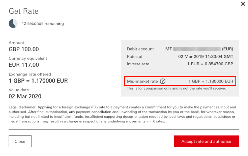 Comptes au Royaume-Uni et à Malte : Amélioration des renseignements sur les opérations de change à venir en avrilDernière mise à jour : 7 avril 2020 En avril 2020, nous allons mettre à niveau nos systèmes pour vous fournir des renseignements plus transparents relativement aux opérations de change dans vos comptes au Royaume-Uni et à Malte. Qu’est-ce qui change? Nous allons ajouter des renseignements sur le taux moyen du marché dans les écrans d’obtention de taux et d’affichage du taux de change dans HSBCnet*. Les renseignements sur le taux moyen du marché vous aident à évaluer le taux de conversion offert pour vos paiements et vos transferts. En quoi consiste le taux moyen du marché de la HSBC? Notre taux moyen du marché indique le point médian entre les taux en vigueur auxquels la HSBC pourrait acheter ou vendre une devise contre une autre sur le marché interbancaire. Il est basé sur le taux du marché pour chaque devise que nous offrons et il varie donc en fonction des conditions du marché. Ce taux est fourni à titre d’information seulement, car il ne tient pas compte de notre tolérance au risque, des coûts et des charges que nous contractons dans le traitement de l’opération et de notre rendement commercial. Voici à quoi ressemblent les nouveaux écrans de la fonction d’obtention de taux :