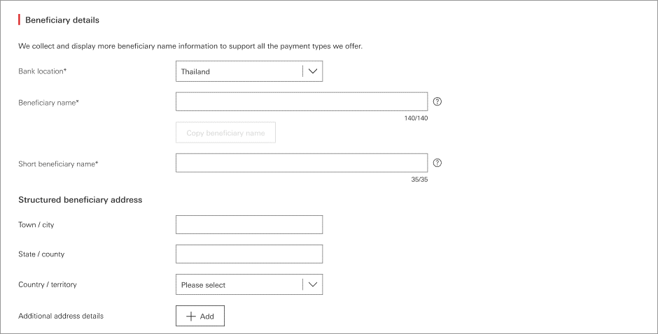 Beneficiary name and short beneficiary name* (extended to support up to 140 characters) |